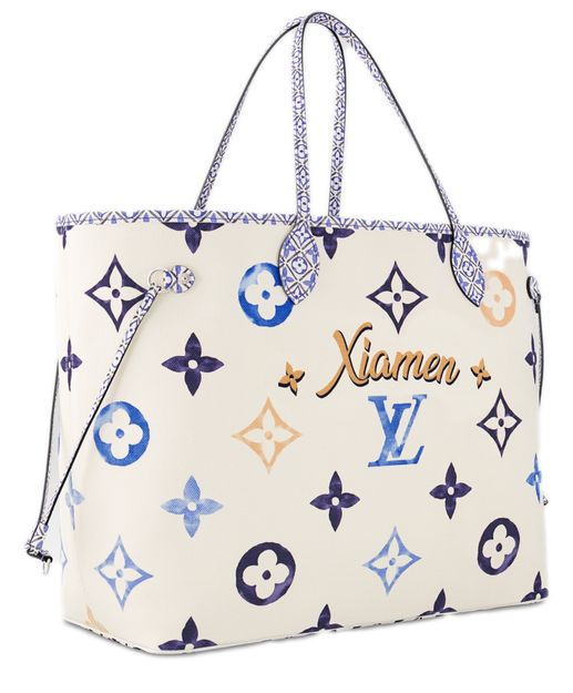 Perfect for summer adventures, this casual-chic Neverfull GM tote is fashioned from cream-color canvas with a Giant Monogram pattern in watercolor shades of blue and beige. A roomy carryall, it has side laces that cinch for a sleeker aspect. There’s a printed removable pouch inside.